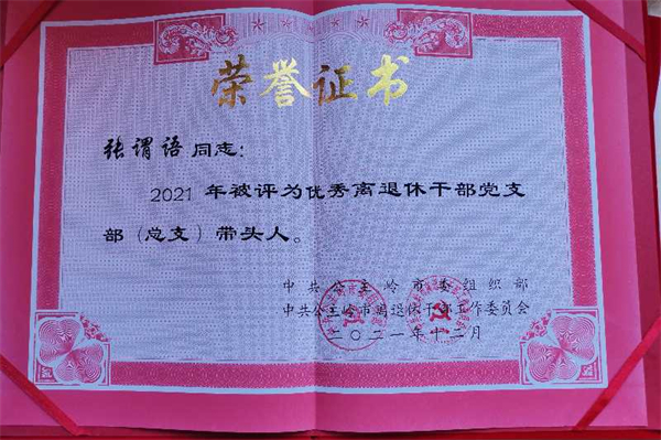离退休干部党支部书记张谓语获得优秀离退休干部党支部带头人称号