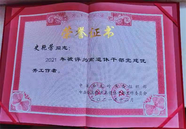 机关党委专职副书记史艳芳获得离退休干部党建优秀工作者称号