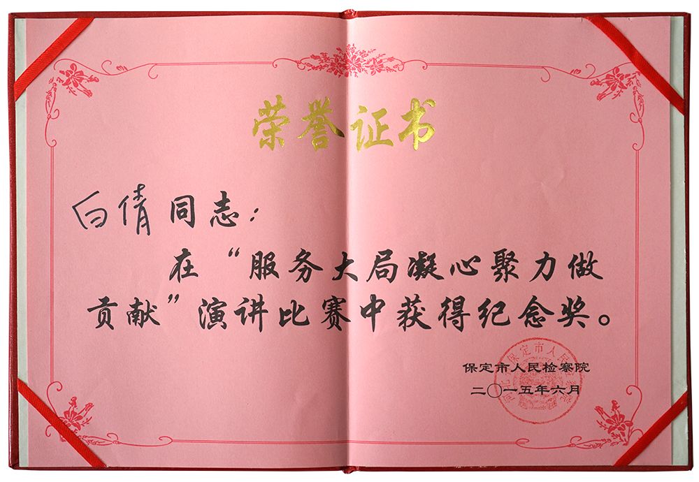她承担着本部门的内勤,并担任党支部书记,办文、办会、办事、办案全方位发展。从组织会议到起草材料,从参加活动到参与主持、宣传,在一点一滴中历练成长。多次被评为“优秀公诉人”、“先进个人”、“优秀共产党员”,并多次在保定市直工委、市院举办的演讲比赛、征文比赛中获奖。