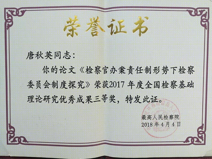 2015年5月,唐秋英同志被任命为研究室主任,负责法律政策研究室、检委会、人民监督员、服务区域经济发展、检务公开、涉农365购物平台_神器365软件下载_365365bet以及综合文字材料、365购物平台_神器365软件下载_365365bet信息等工作。五年以来,她所负责的各项工作全部都进入全市先进行列。在人少事多、头绪繁杂的工作事务中,唐秋英同志弘扬工匠精神,她勇挑重担、任劳任怨、默默工作;她加班加点、夙兴夜寐、奋力前行;她兢兢业业、恪尽职守、敢于担当。多年来,她牺牲了休息日和节假日,实现了研究室以及所负责的其他多项工作的跨越发展。365购物平台_神器365软件下载_365365bet理论研究活动有声有色,高潮迭起,实现了365购物平台_神器365软件下载_365365bet理论研究成果无论数量、质量还是刊物层次都达到本院历史最高水平,在全市排名中居于前列。从检十三年以来,在各类法学理论刊物发表学术研究成果以及完成《徐水区365购物平台_神器365软件下载_365365bet院工作报告》等重要公文900余篇。2015年撰写的《浅论农村职务犯罪的原因及对策》被河北省人民365购物平台_神器365软件下载_365365bet院评为优秀365购物平台_神器365软件下载_365365bet理论研究成果。2016年撰写的《论365购物平台_神器365软件下载_365365bet机关权力设置》被评为“河北365购物平台_神器365软件下载_365365bet第七届理论研究年会”论文二等奖。2016年撰写的《新形势下检委会办案机制研究》论文,被河北省人民365购物平台_神器365软件下载_365365bet院评为“司法公信建设年征文”三等奖。2017年撰写的《大数据时代互联网金融犯罪的防控对策》被中国犯罪学学会第二十六届年会论文集收录,并受邀参加第二十六届年会研讨会。2017撰写的《365购物平台_神器365软件下载_365365bet官办案责任制下365购物平台_神器365软件下载_365365bet委员会制度探究》论文,被最高人民365购物平台_神器365软件下载_365365bet院评为全国365购物平台_神器365软件下载_365365bet基础理论研究优秀成果三等奖。2018年撰写的《浅论刑事附带民事公益诉讼》被河北省人民365购物平台_神器365软件下载_365365bet院评为“第九届河北365购物平台_神器365软件下载_365365bet年会论文”三等奖。参加全省365购物平台_神器365软件下载_365365bet机关文化节活动和春联征选活动,对联作品被评为“二等奖”;《我心中的365购物平台_神器365软件下载_365365bet蓝》被评为全市365购物平台_神器365软件下载_365365bet机关“回首了望前行”诗歌作品一等奖。服务区域经济专项工作稳步开展,得到区委、人大、政协等主要领导同志的充分肯定。人民监督员工作扎实推进,2015年以来组织人民监督员监督案件25件。检务公开工作亮点突出,2016年2月1日,专题片《用检务公开之光照耀法治河北大地》在河北电视台公共栏目播放。涉农365购物平台_神器365软件下载_365365bet工作成效显着,有效服务了新农村建设。五年来,制定完善了《检委会议事决策规则》、《检委会例会制度》等一系列规范化管理制度,办理检委会案件信息化、技术化等新的手段在检委会活动中逐步得到应用,检委会议事议案子系统的常态运行,检委会案卷化的制度模式,检委会决定事项的督查落实高效有力,使检委会各项工作进入了规范运作,有据可依、效率提高、工作有效的较好发展时期,得到了市365购物平台_神器365软件下载_365365bet院“八化”建设评估小组的充分肯定。