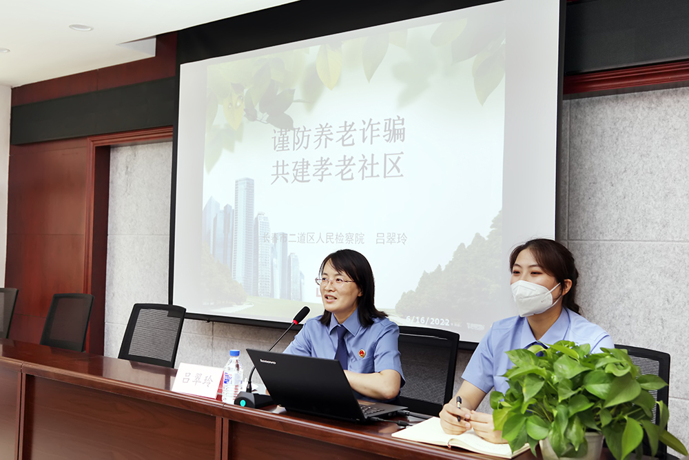 6月16日,二道区365购物平台_神器365软件下载_365365bet院第二365购物平台_神器365软件下载_365365bet部主任吕翠玲、联合支部组织委员王盈企来到二道区远达街道新泰社区,结合打击整治养老诈骗专项行动,以“谨防养老诈骗,共建孝老社区”为题,为社区群众进行了一次如何预防养老诈骗正面宣传教育活动。