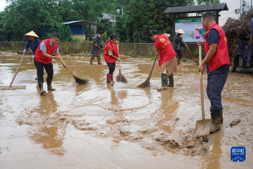 2022年6月21日,在江西省德兴市泗洲镇张家畈社区,党员干部在清理淤泥和垃圾。新华社记者 周密 摄