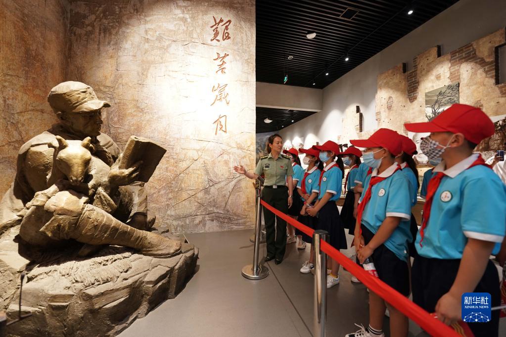 2021年5月30日,在位于河北省邢台市信都区浆水镇的中国人民抗日军政大学陈列馆,工作人员向小学生们讲述抗大历史。新华社记者 牟宇 摄