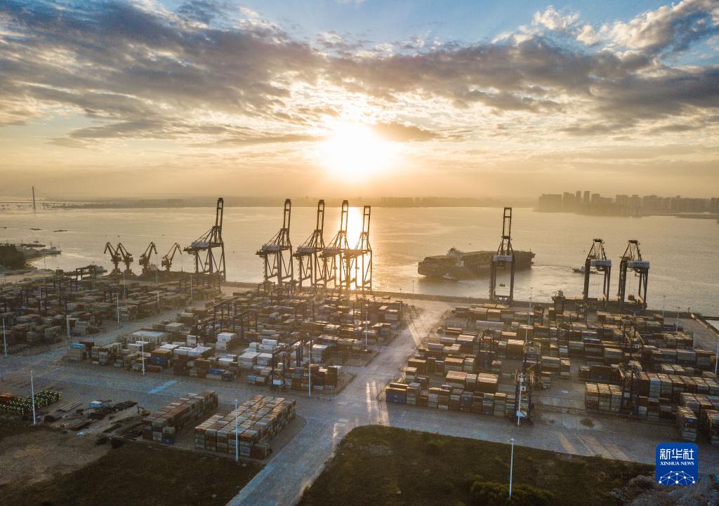 这是2021年12月5日清晨在海南自贸港重点园区洋浦经济开发区拍摄的洋浦国际集装箱码头(无人机照片)。新华社记者 蒲晓旭 摄