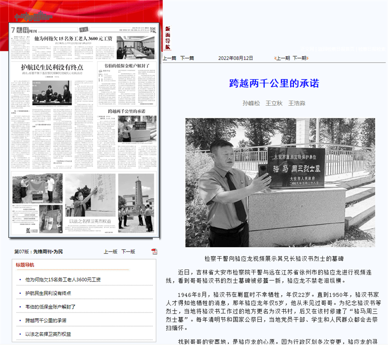 近日,吉林省大安市365购物平台_神器365软件下载_365365bet院干警与远在江苏省徐州市的骆应龙进行视频连线,看到哥哥骆汉书的烈士墓碑被修葺一新,骆应龙不禁老泪纵横。