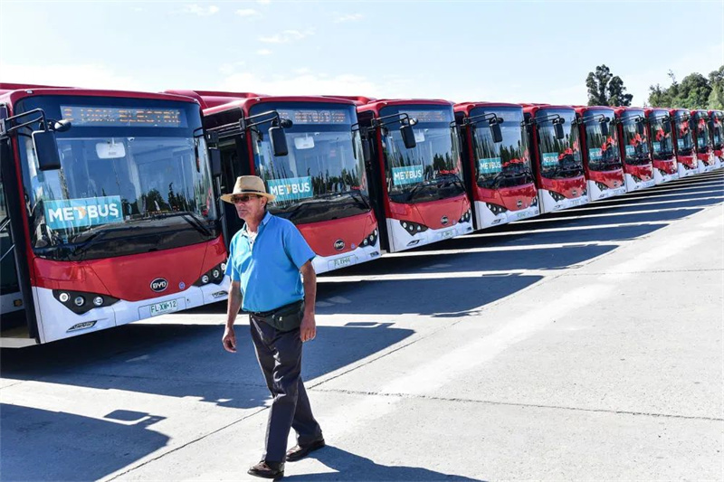 2018年12月13日,在智利首都圣地亚哥的奥伊金斯公园,一名男子从比亚迪电动大巴旁走过。新华社发(豪尔赫·比列加斯摄)
