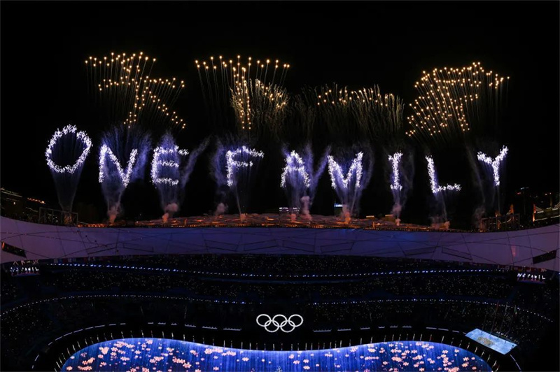 2022年2月20日,中英文“天下一家”字样造型的焰火在国家体育场上空绚丽绽放,为北京冬奥会闭幕式留下美好的永恒瞬间。