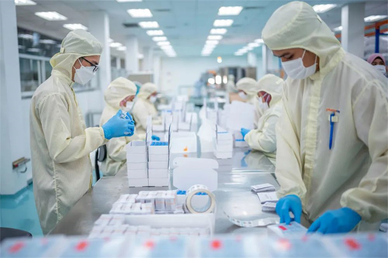 2021年10月5日,在马来西亚吉隆坡郊区的发马公司灌装工厂,工人在包装本地灌装生产的科兴疫苗。新华社记者 朱炜 摄
