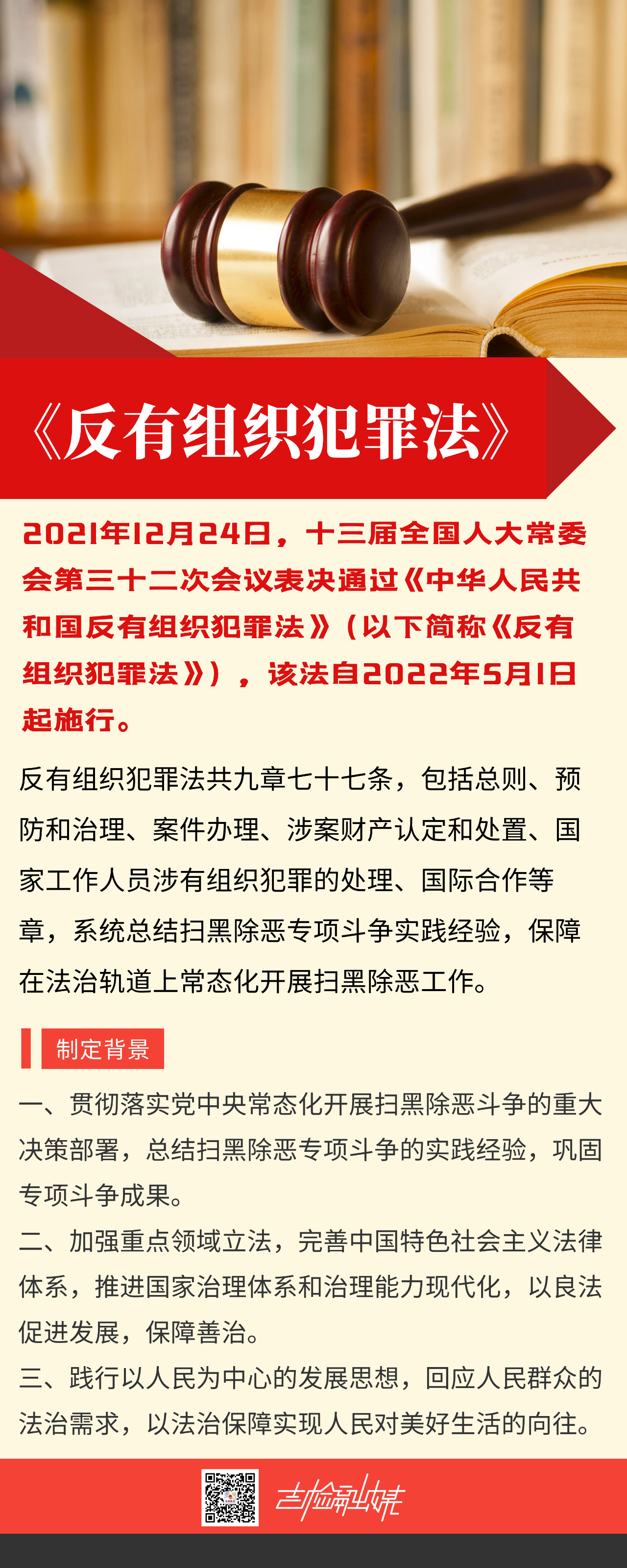 《反有组织犯罪法》是总结扫黑除恶专项斗争经验,加强制度建设,保障在法治轨道上常态化、机制化开展扫黑除恶工作的重要举措。对于建设更高水平的平安中国、法治中国,不断增强人民群众的获得感、幸福感、安全感,确保人民安居乐业、社会安定有序、国家长治久安,具有重大意义。接下来,我们将以每日一学的方式,陆续推出《反有组织犯罪法》的内容图解。