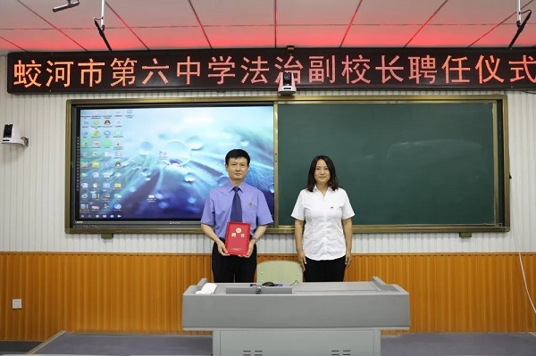 为深入贯彻落实习近平法治思想,结合“检爱同行,共护未来”法律监督专项行动的开展,谭佩林受聘为蛟河市第六中学法治副校长。