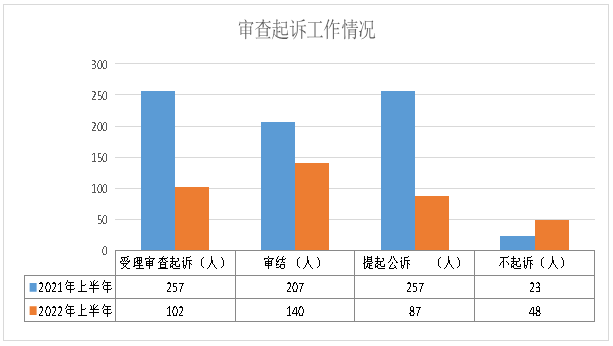 审查起诉业务受理78件102人,受理案件数量和人数同比分别减少59.4%、60.3%。审结96件140人,审结案件数量和人数同比分别减少38.1%、32.4%。起诉65件87人,起诉案件数量和人数同比减少52.2%,52.5%;不起诉28件48人,不起诉案件数量和人数同比分别增加55.6%、52.1%。