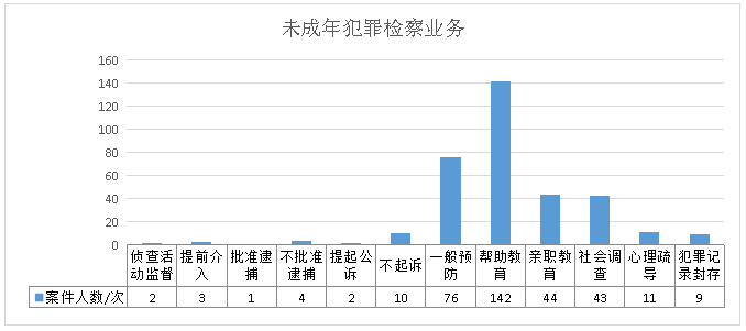 一般预防76次,心理疏导11次,社会调查43次,亲职教育44次,帮助教育142次,犯罪记录封存9人。