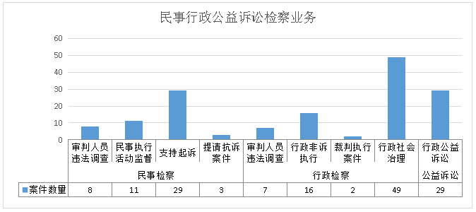 2022年上半年共办理民事行政公益诉讼各类案件151件。包括民事案件51件,审判人员违法调查8件(其中涉及虚假诉讼案件1件),对民事执行活动的监督11件,支持起诉29件,提请抗诉案件3件(均为虚假诉讼案件);行政案件74件(其中行政争议实质化解53件),审判人员违法调查7件,社会治理49件,行政非诉执行案件16件,裁判执行案件2件;行政公益诉讼案件29件。
