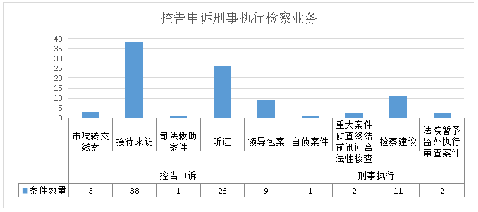 控告申诉部门:受理市院转来线索3件;接待来访38件(次),其中刑事申诉1件,民事申诉1件,立案监督1件,其他信访35件(次)。办理司法救助案件1件,发放司法救助金2万元;开展简易听证24次(其中上门听证4次),普通听证2次;领导包案9件。