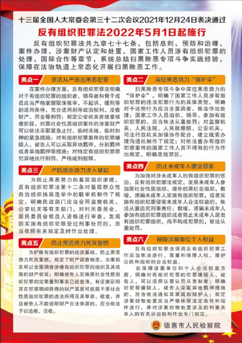 《中华人民共和国反有组织犯罪法》于2022年5月1日实施。为有效预防和惩治有组织犯罪,提高人民群众的知晓度、参与度,德惠市人民365购物平台_神器365软件下载_365365bet院第一365购物平台_神器365软件下载_365365bet部按照上级院部署,开展《中华人民共和国反有组织犯罪法》学习宣传活动。