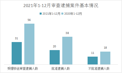 1.案件受理及办理数据。1-12月,共受理公安机关提请批准逮捕案件21件31人,同比件数下降34.38%,同比人数下降44.64%;批准逮捕17件20人,同比件数下降37.04%,同比人数下降47.37%;不批准逮捕4件11人,同比件数下降20%,同比人数下降38.89%(见图1)。