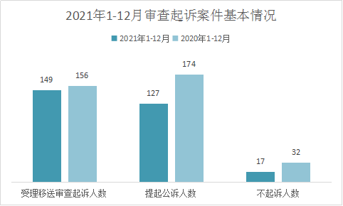 1.案件受理及办理数据。1-12月,共受理移送审查起诉案件98件149人,同比件数下降7.55%,人数下降4.49%%;提起公诉78件127人,同比件数下降22.77%,人数下降27.01%;不起诉11件17人,同比件数下降52.17%,人数下降46.88%。(见图2)