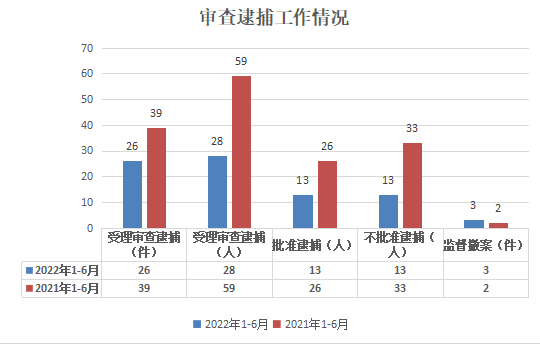 受理各类审查逮捕案件26件28人,同比分别下降33.3%和52.5%;批准和决定逮捕13件13人,同比分别下降50%和60.6%;不批准逮捕10件11人,同比分别下降28.6%和60.7%;监督立案受理1件,同比下降50%,监督撤案3件,同比上升50%;对侦查活动书面提出纠正违法5件次,同比上升25%。