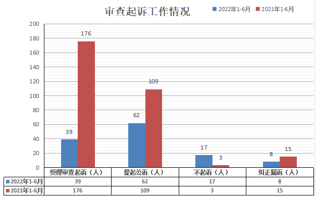 受理审查起诉案件35件39人,同比分别下降50.7%和77.8%;提起公诉35件62人,同比分别下降37.5%和43.1%;不起诉12件17人,同比分别上升300%和466.7%;纠正漏诉8人,同比减少7人;提出抗诉1件,同比持平,提请抗诉1件;侦查阶段羁押必要性审查1人,同比增加1人;审判阶段羁押必要性审查2人,同比下降83.3%,审判活动监督中书面提出纠正5件。