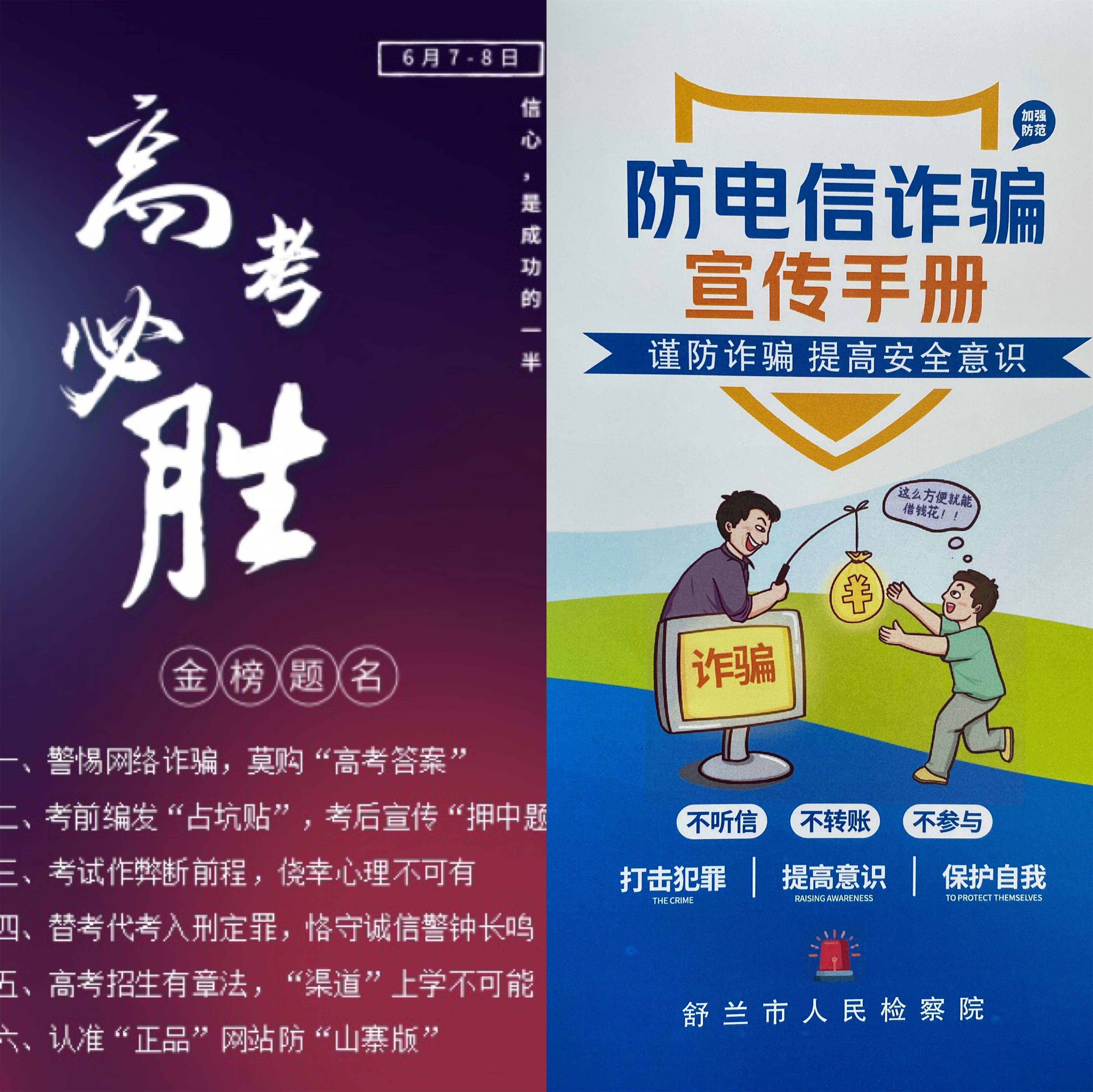 高考是学子们面临的一次大考,家长们都希望孩子能考上理想的学校。从临近高考开始,一些不法分子动起了“歪脑筋”,借高考散布虚假信息,误导考生和公众,为提升考生、家长对高考期间电信诈骗的防范意识和分辨能力,舒心未检工作室梳理汇总了近年来常见的诈骗手段和虚假信息,结合《中华人民共和国刑法》和《中华人民共和国预防未成年人犯罪法》,制成“防电信诈骗”普法手册和“教你六招避陷阱”宣传单,在考场外最醒目的位置挂起宣传条幅,提醒广大考生和家长切勿触碰法律的红线,同时提供了明辨网络谣言妙招,谨防上当受骗。