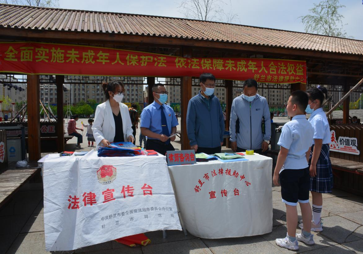此次活动以“全面推进未成年人保护法的实施,依法保护未成年人的合法权益”为主题,在舒兰市未成年人经常活动的场所——幸福广场和青少年业余体校分别进行了宣传活动。在活动现场悬挂了宣传条幅,发放了共同制作的《家庭教育促进法》、《法律援助法》、民法典图册、《未成年保护法》等宣传彩页和宣传单,