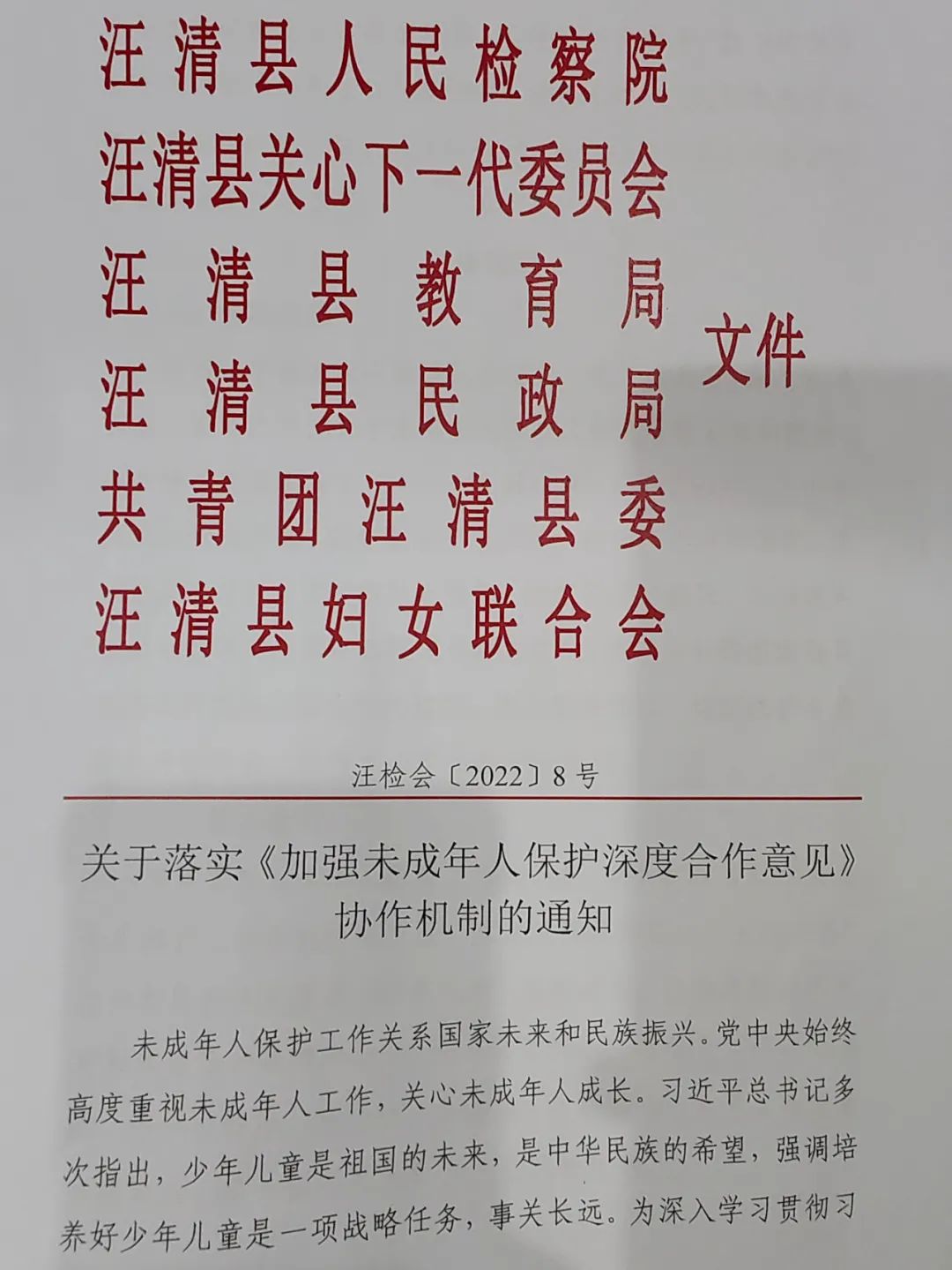为深入学习贯彻习近平总书记重要指示批示精神,贯彻落实党中央、国务院关于加强未成年人保护工作决策部署,推动《中华人民共和国未成年人保护法》等法律法规落地落细,汪清县人民365购物平台_神器365软件下载_365365bet院牵头,与汪清县教育局、汪清县民政局、汪清县关心下一代委员会、汪清县妇女联合会、共青团汪清县委会签了《加强未成年人保护深度合作意见》协作机制。