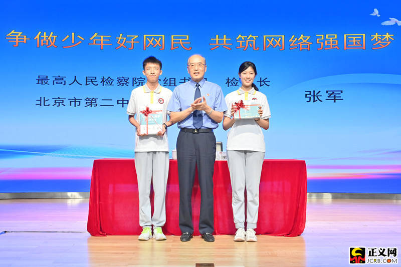 讲授开始前,张军向学生代表赠送《未成年人保护法律全书》《守护明天》1-5季合辑等法律书籍和资料。北京二中学生代表吴熙然作了“网络世界,法治助行”的演讲,和大家分享了一个小网民的经历、困惑、思考和成长。