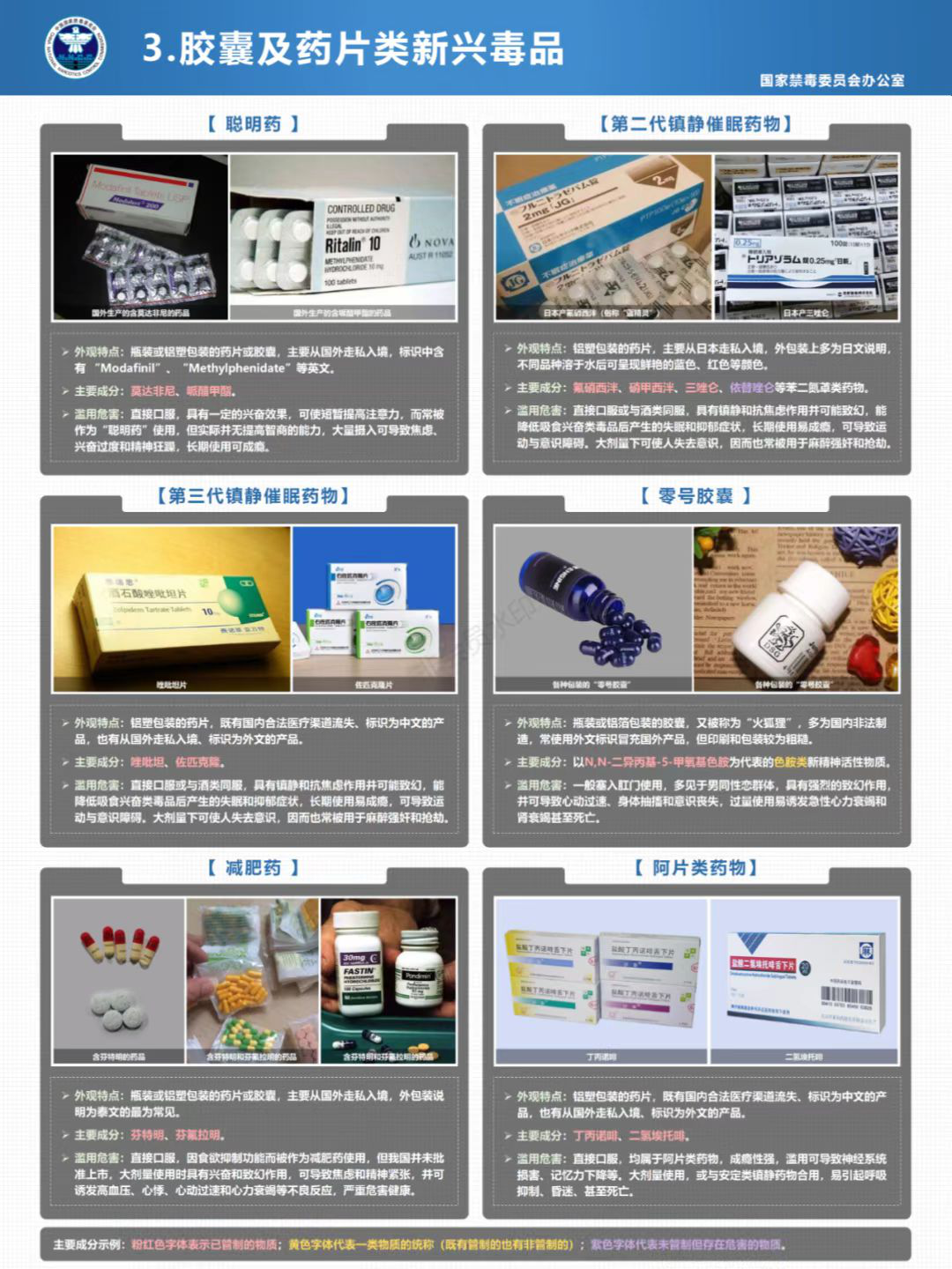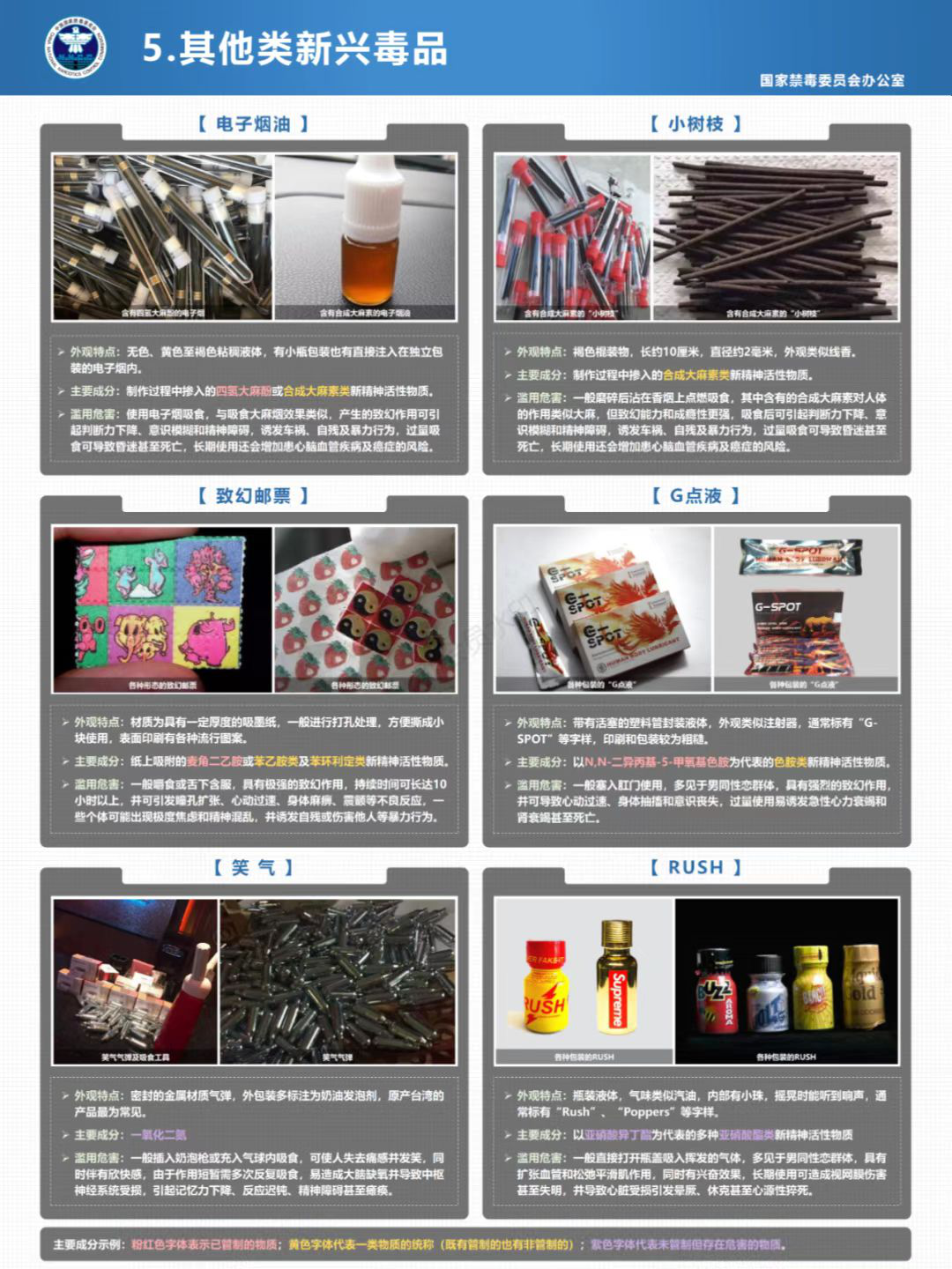 为了进一步普及禁毒知识,提高社会公众特别是青少年识毒、防毒、拒毒的能力,国家禁毒办曾经专门设计过一套关于常见新兴毒品的禁毒宣传教育挂图,详述了各类新兴毒品的外观特点、主要成分和滥用危害。
