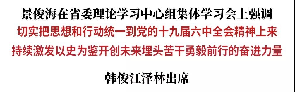 12月1日,省委书记景俊海主持召开省委理论学习中心组集体学习会,围绕学习贯彻党的十九届六中全会精神进行研讨交流。景俊海强调,要坚持以习近平新时代中国特色社会主义思想为指引,按照省委十一届十次全会部署要求,切实把思想和行动统一到党的十九届六中全会精神上来,持续激发以史为鉴、开创未来、埋头苦干、勇毅前行的奋进力量,加快推动吉林振兴率先实现新突破。省委副书记、省长韩俊,省政协主席江泽林出席会议。